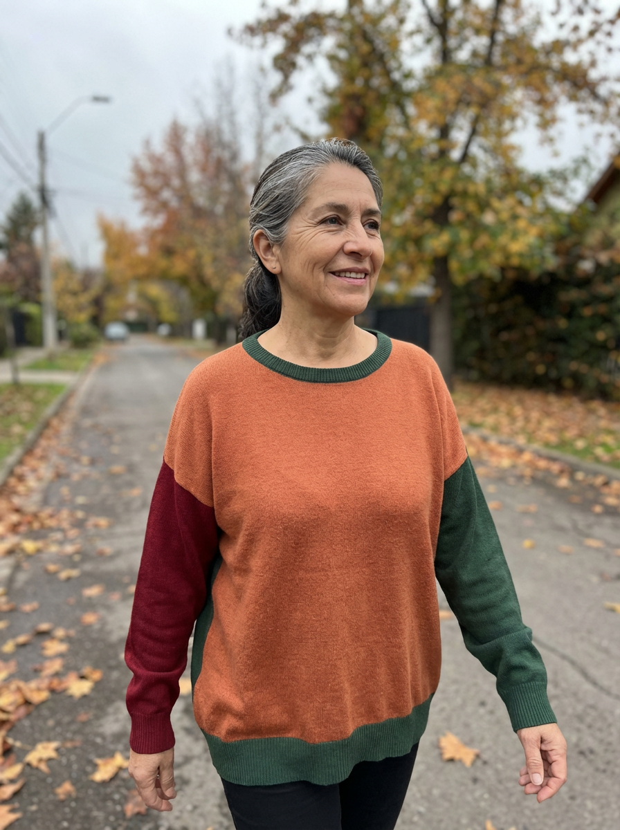 «Este jersey es muy cómodo y suave, y me encantan los colores: son alegres, pero sutiles. El corte es holgado sin ser demasiado amplio, y es lo suficientemente cálido como para dar un paseo al aire libre en un fresco día de otoño. ¡Ya me han hecho varios cumplidos!».